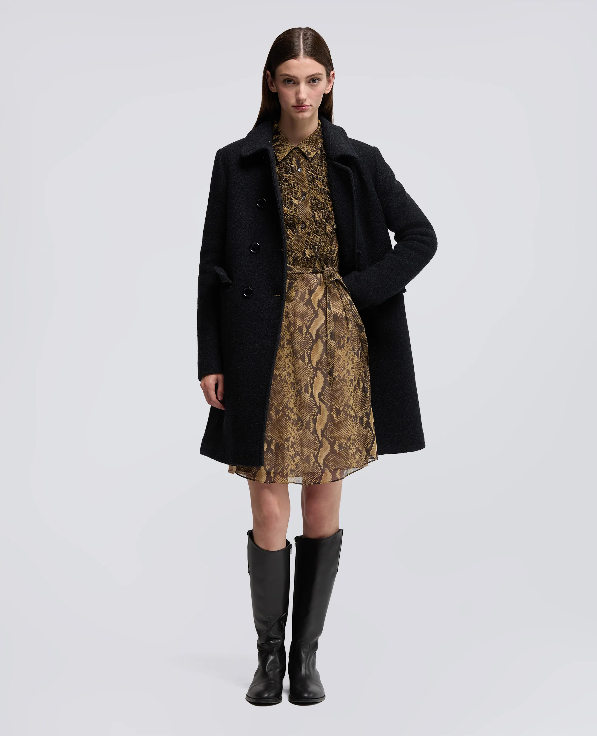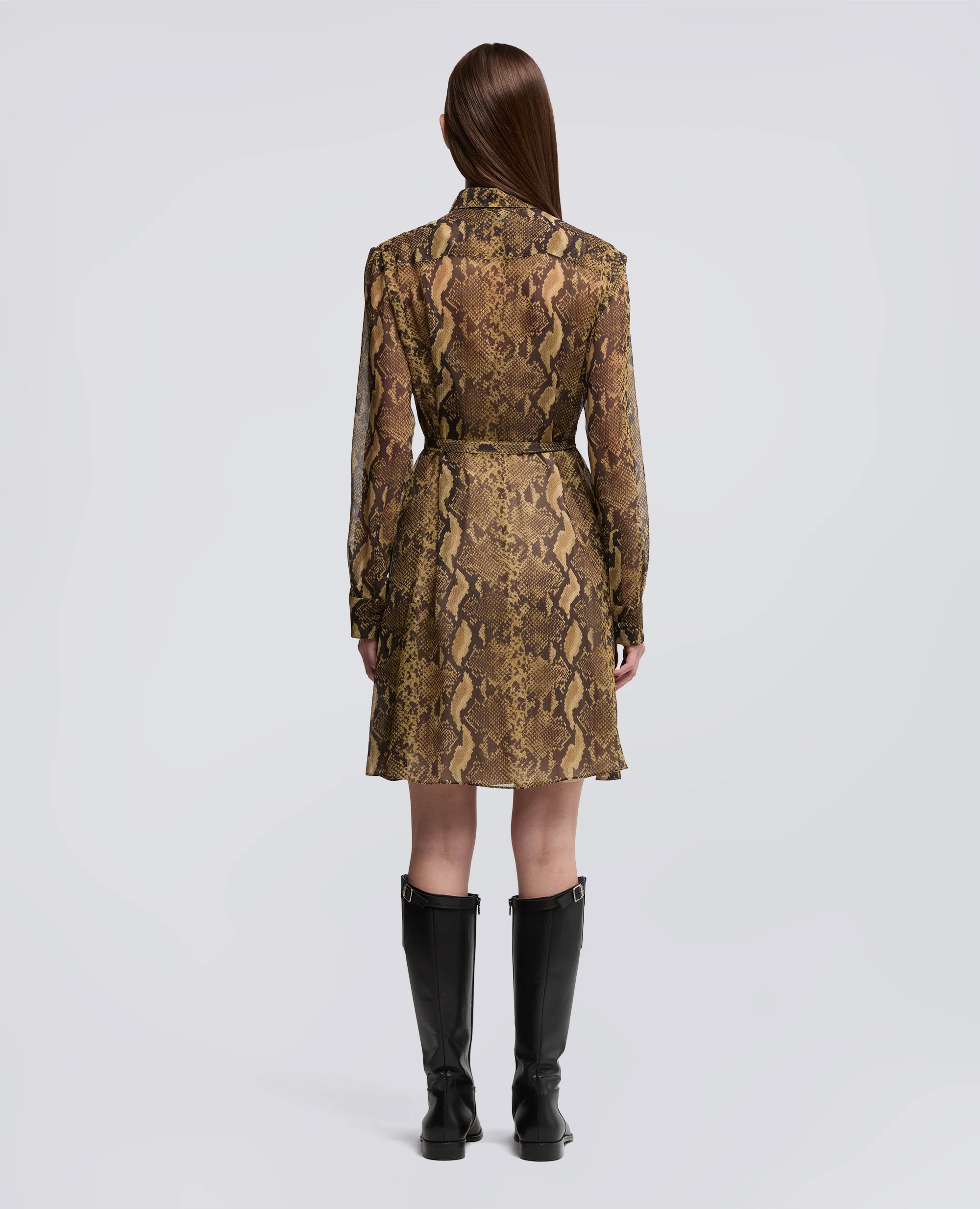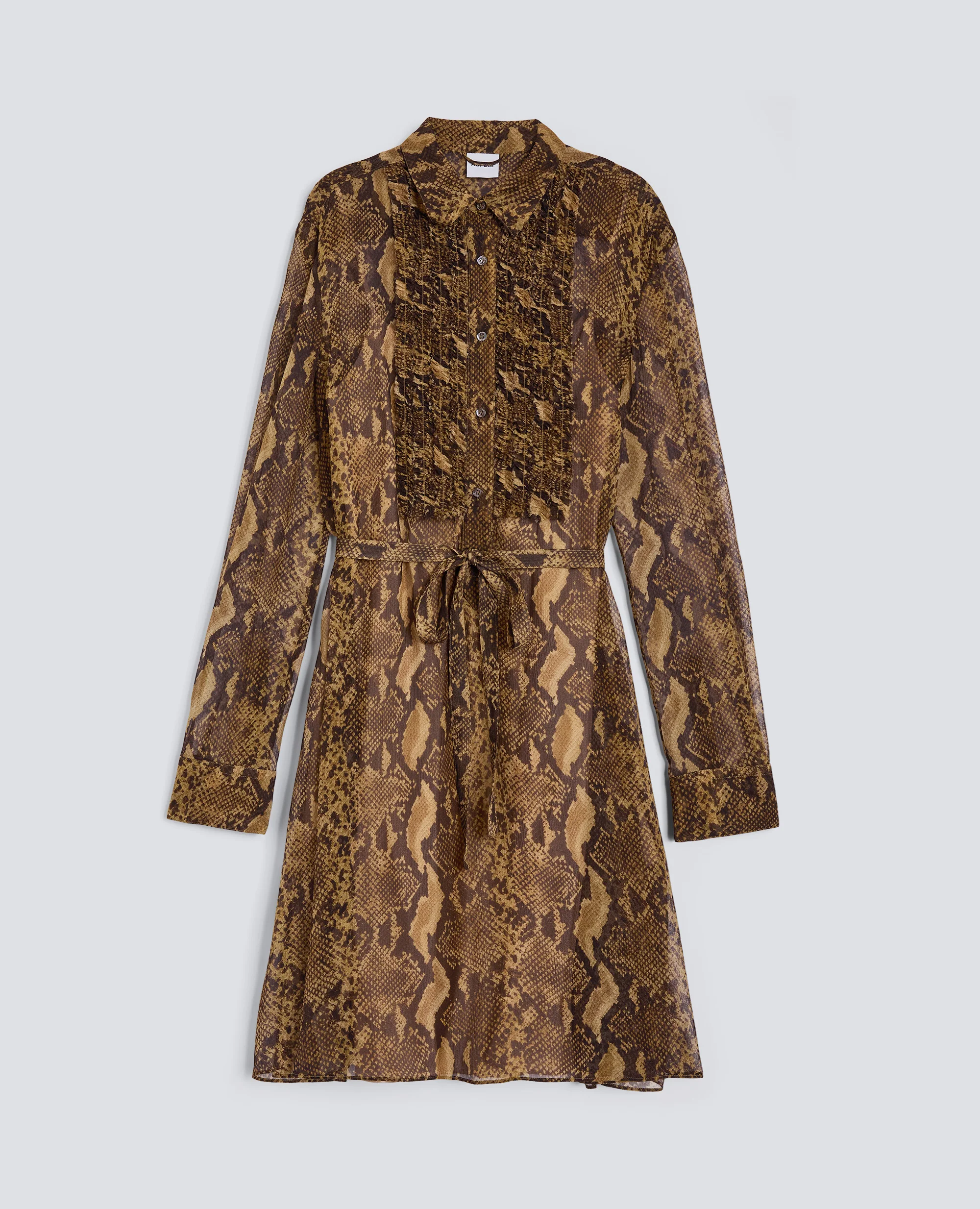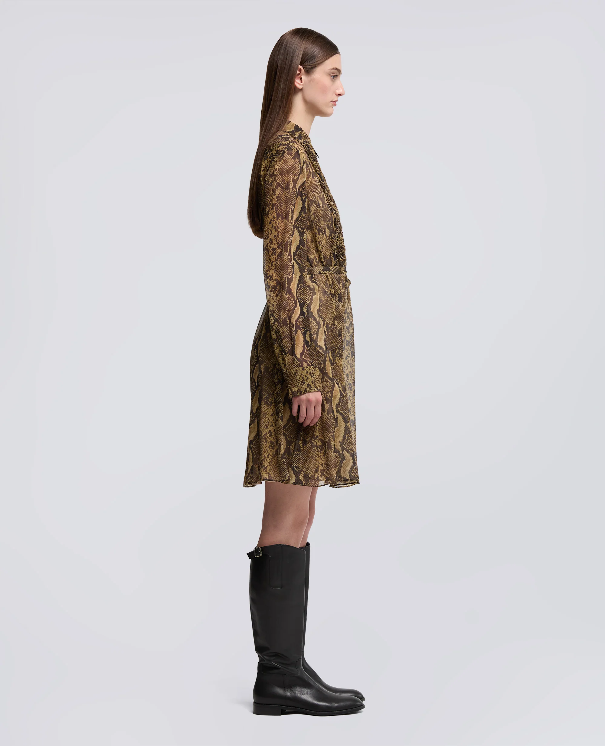 Abito chemisier in crepon di seta caratterizzato da una linea ad A leggermente svasata, da una stampa pitone all over e da una sottoveste in viscosa con spalline regolabili. Il modello presenta maniche lunghe rifinite da polsini con bottone, tasche inserite nei fianchi e un collo a camicia con apertura in stile polo. Il design e rifinito da un inserto anteriore con ruches in corrispondenza dell’apertura, da una cintura a nastro in tessuto coordinato da annodare in vita e da un raffinato carre posteriore. Vestibilita regolare.