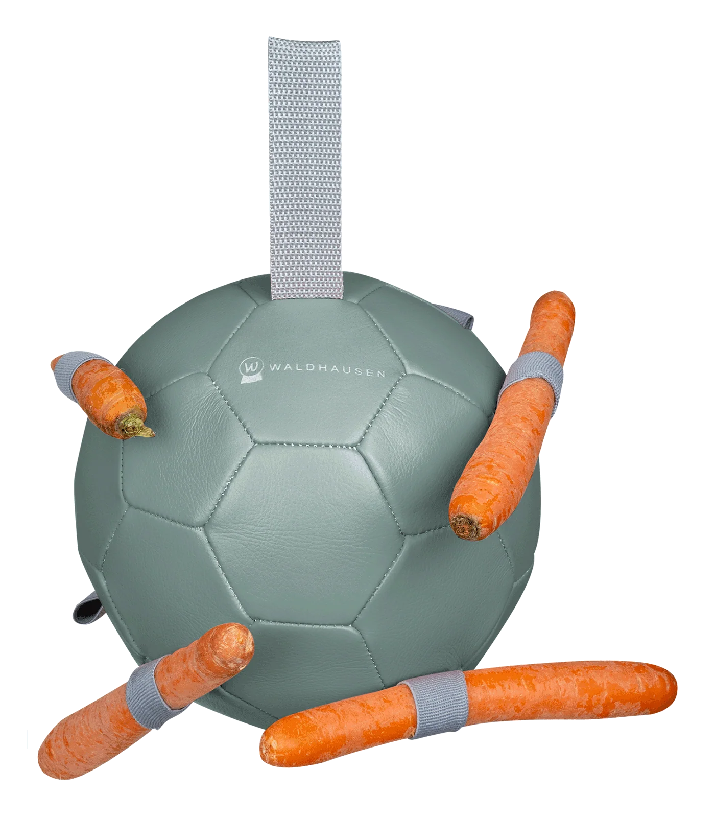 La sangle supérieure en nylon sert à la suspendre facilement dans l’écurie ou au pré. Les lanières en caoutchouc fixées dessus permettent d’y glisser des carottes ou tout autre type de snacks tels que des morceaux de pommes, des friandises ou du foin.