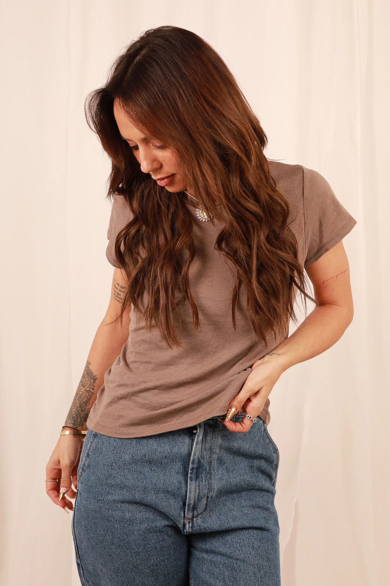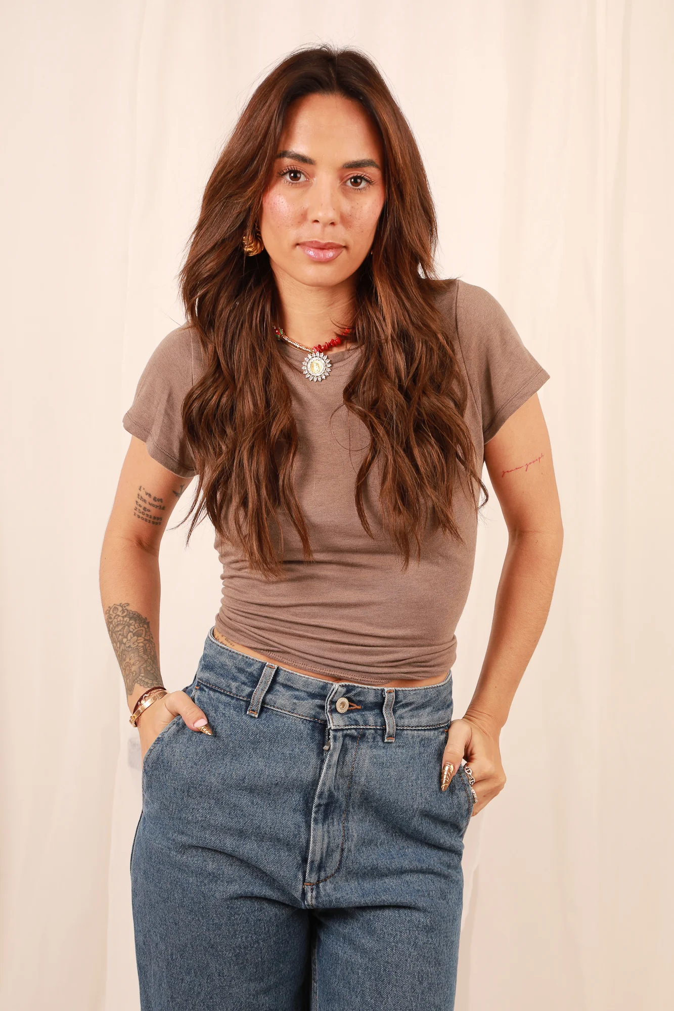 Sa coupe basique, mais résolument intemporelle, s’adapte à toutes vos envies de style. Comme le montrent nos photos, vous avez également la possibilité de le nouer à l’arrière pour créer un crop top cintré, apportant ainsi une touche de modernité à votre look. Que vous le portiez de manière classique ou transformé en crop top, ce T-shirt polyvalent saura s’imposer comme un indispensable de votre garde-robe.